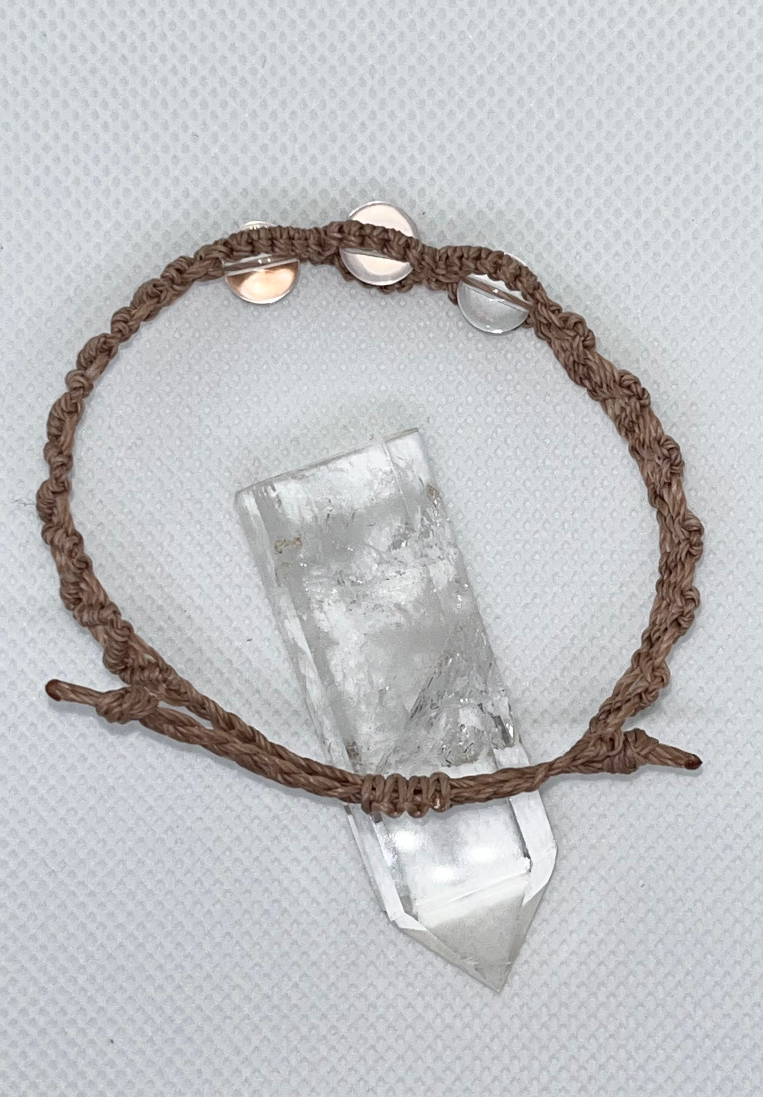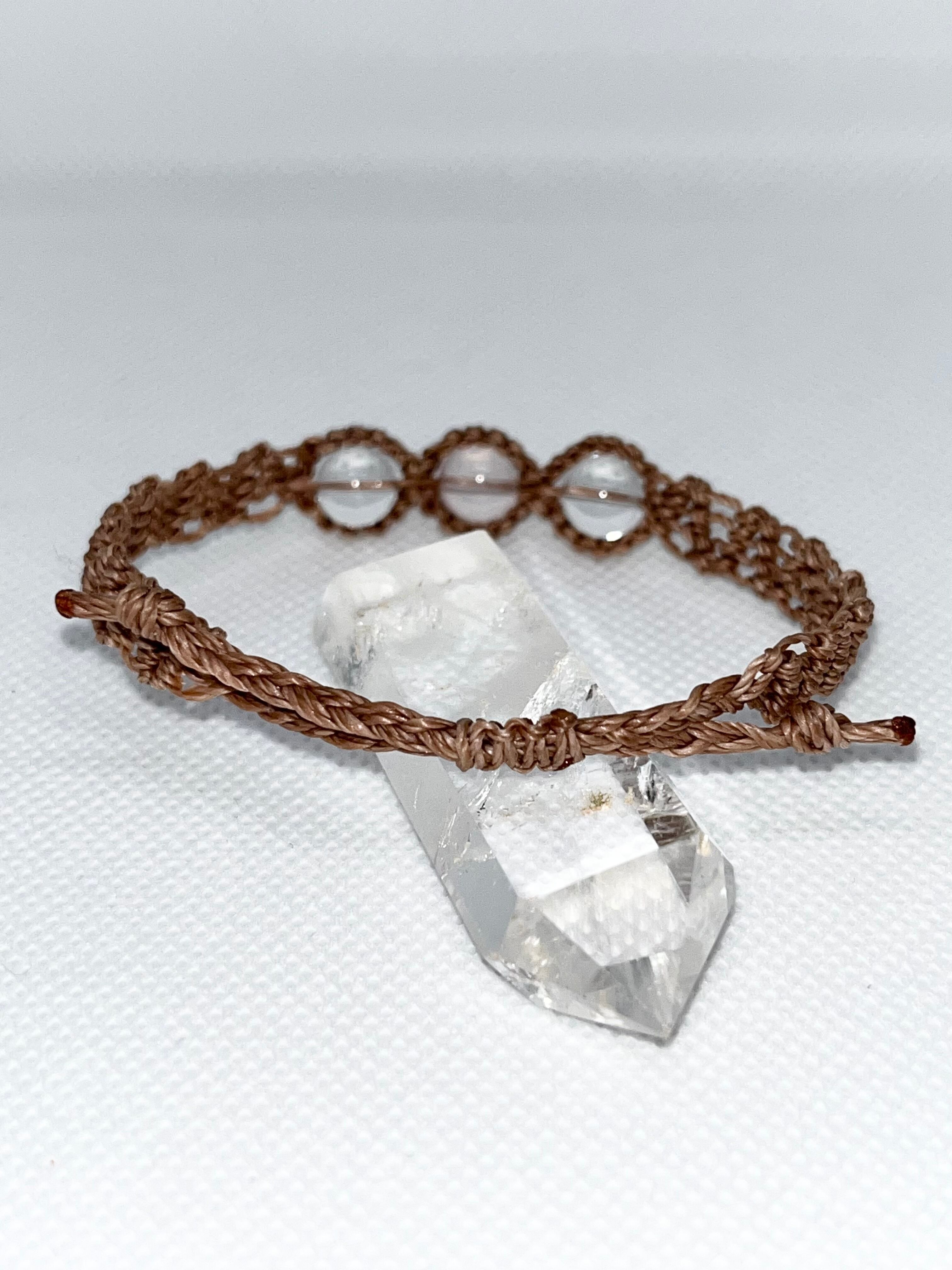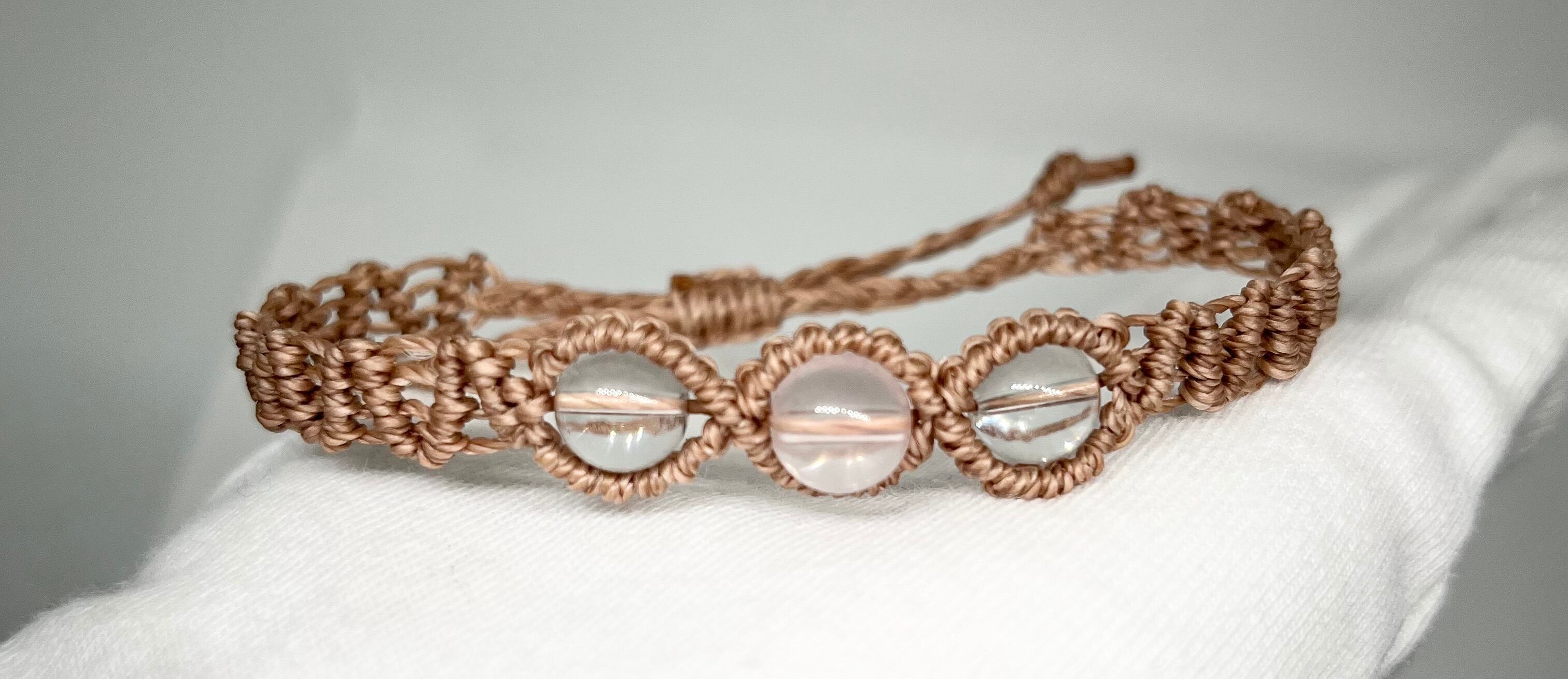 ほんのり桜色に透ける、やさしいローズクォーツを中心に透明感のある水晶を合わせたマクラメブレスレットです。
