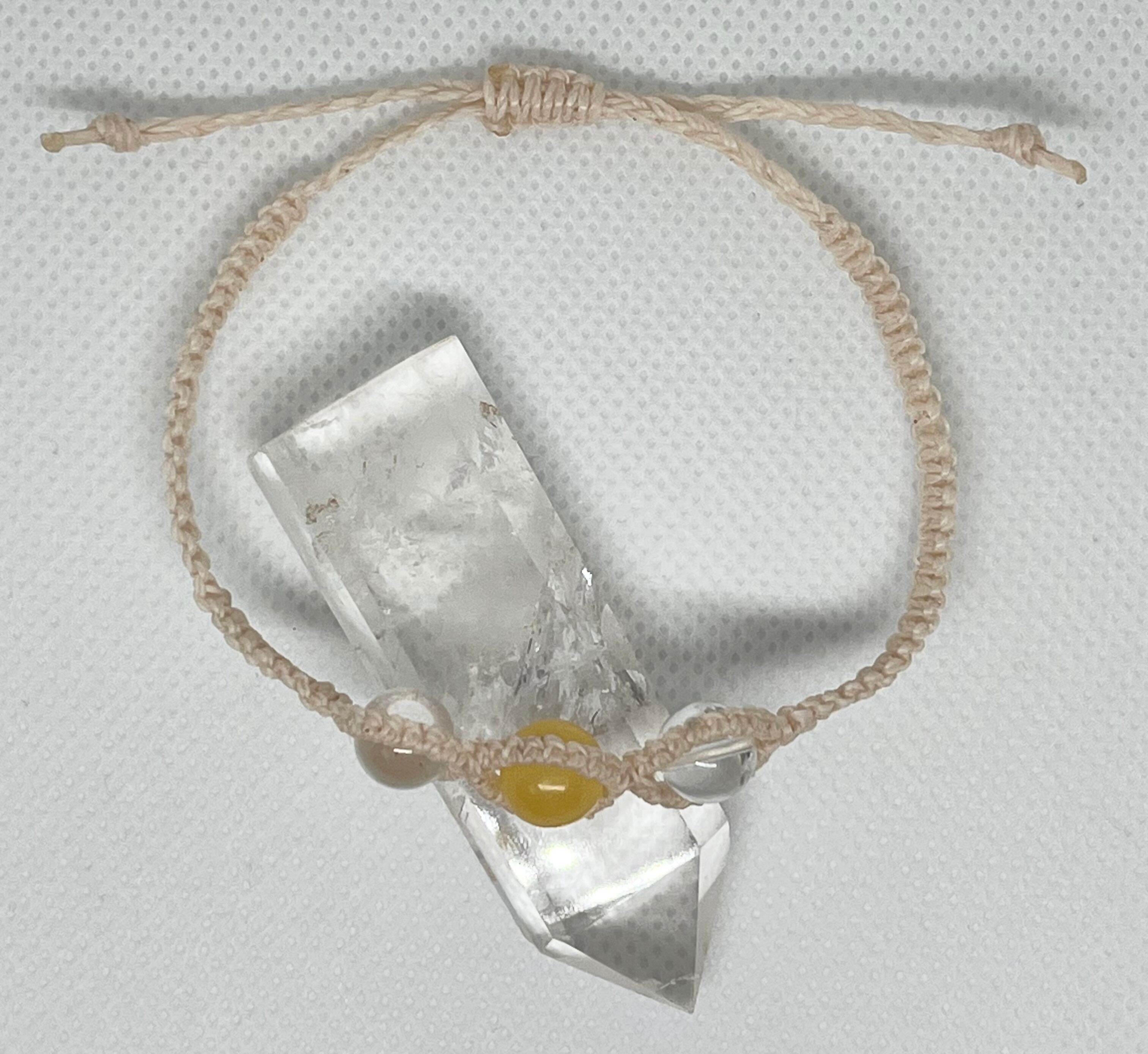 両サイドに透明感のある水晶を合わせたシンプルなデザインのマクラメブレスレットです。